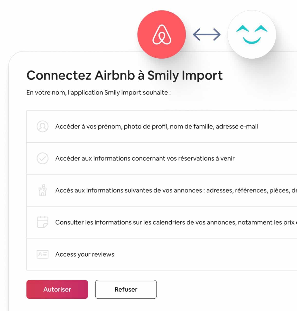 Il vous suffit de cliquer sur ce lien puis sur le bouton "Connecter Airbnb et recevoir mon audit gratuit". Autorisez ensuite Smily Import à consulter vos annonces Airbnb de manière sécurisée.