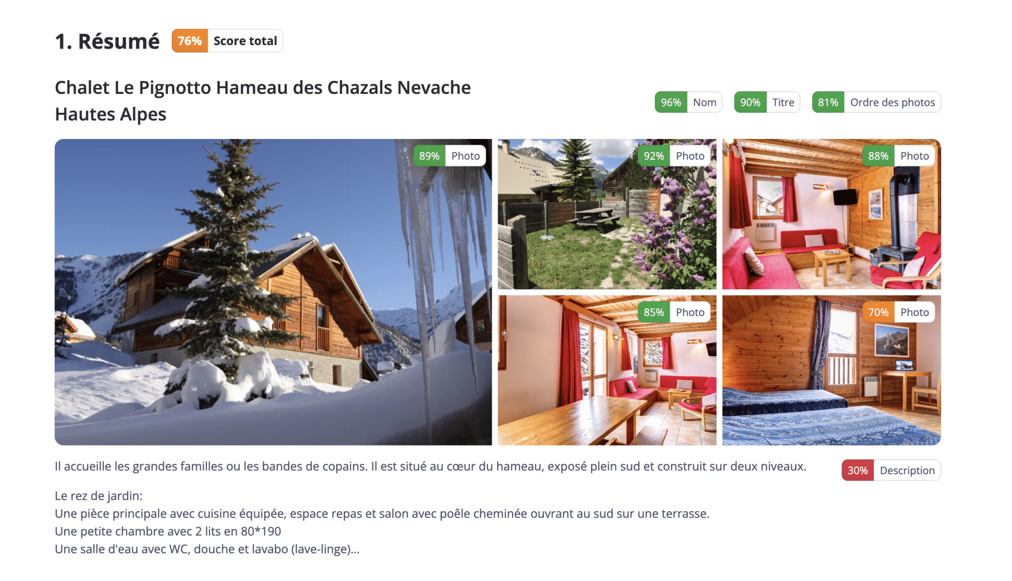 Avec un score total de 76%, cette annonce de location d'un chalet situé dans les Hautes Alpes offre de nombreuses pistes d'amélioration.